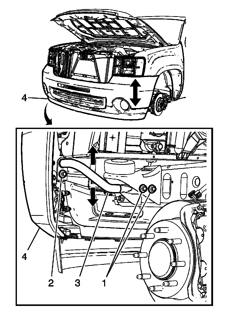 5.Push downward on the end of the front bumper impact bar (4) to lower if needed.