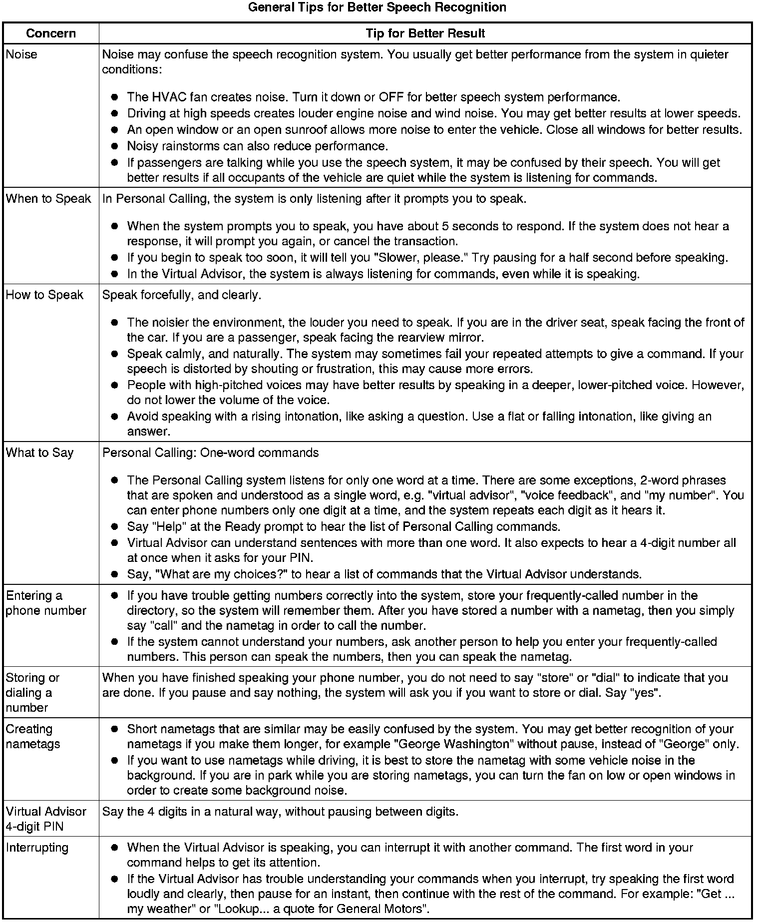 The OnStar(R) speech recognition systems use speech technology that is designed to understand a wide range of American English speakers. Although there is no one right way to speak English, the system will work best when users try to modify their pronunciation should they encounter difficulty. Users who do not obtain good results are advised to try the tips and work-arounds found in this section.