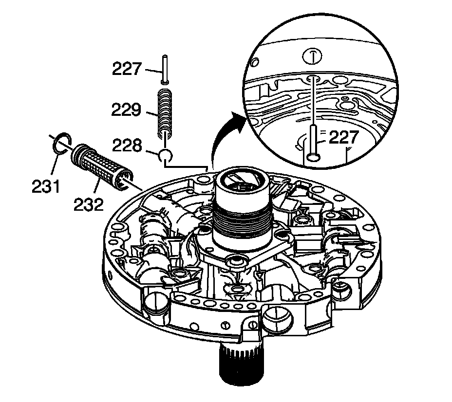 10. Install the stop valve (223) and the oil pump converter clutch valve retaining ring (222).