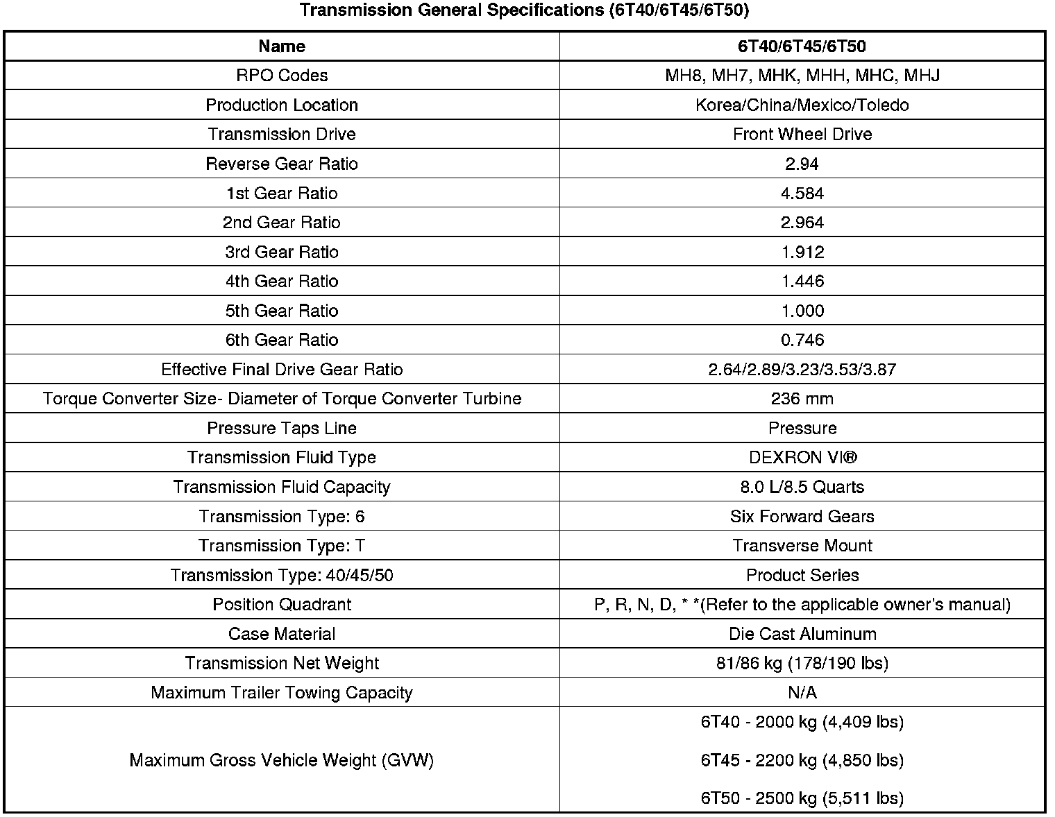 Transmission General Specifications (6T40/6T45/6T50)