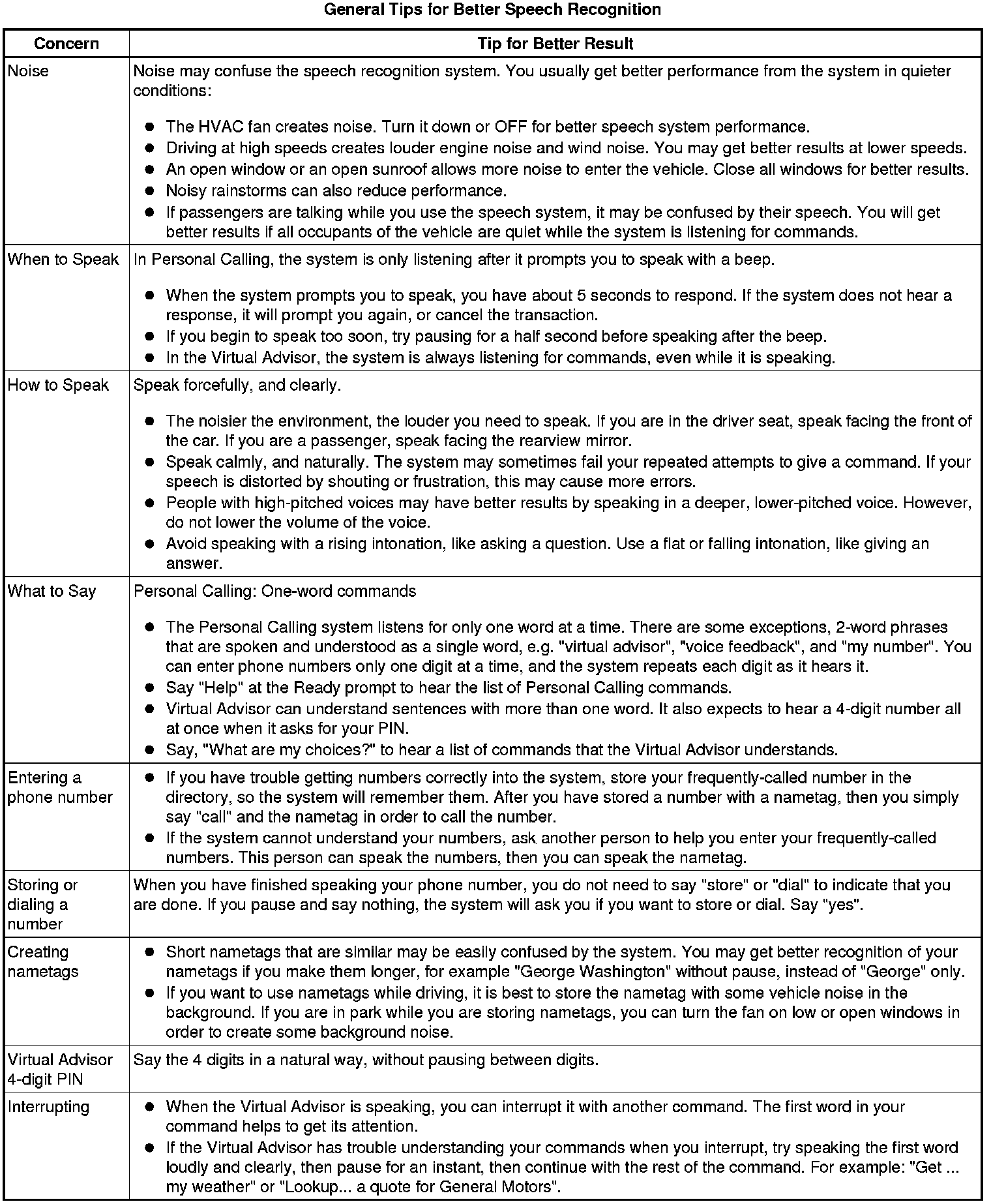 The OnStar(R) speech recognition systems use speech technology that is designed to understand a wide range of American English speakers. Although there is no one right way to speak English, the system will work best when users try to modify their pronunciation should they encounter difficulty. Users who do not obtain good results are advised to try the tips and workarounds found in this section.