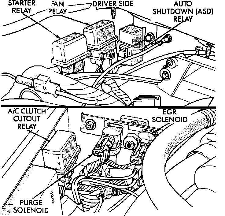 If the SBEC senses a wide open throttle or low idle speed condition, via the throttle position sensor, it will remove the ground to the radiator fan relay, which will not allow power to get to the A/C clutch relay, preventing A/C clutch engagement.