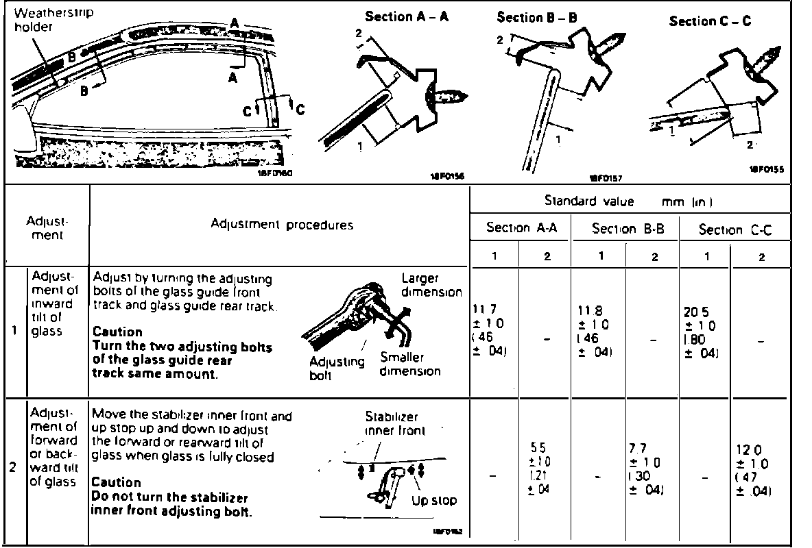 Stealth models built prior to November 1, 1990 may exhibit a wind noise along the top of the left door glass. To eliminate this condition, the clearance specification between the weatherstrip holder and the door glass (Section A-A) has been decreased as indicated in red on the chart below. When adjusting the door glass in vehicles built prior to the date given above, use the revised specification with the adjustment procedure on pages 23A-21 thru 23 in the 1991 Stealth Import Service Manual, Volume 1, (PN81-270-1115).