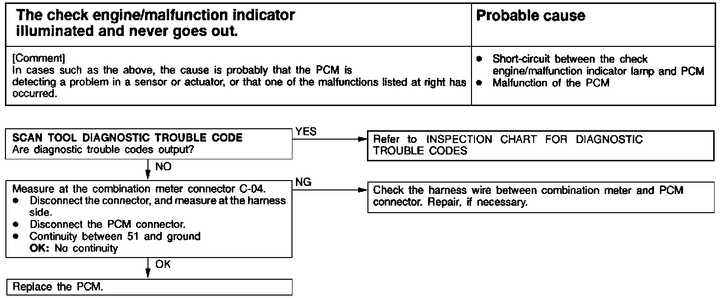 The check engine malfunction indicator lamp does not illuminate immediately after the ignition switch is turned to ON.
