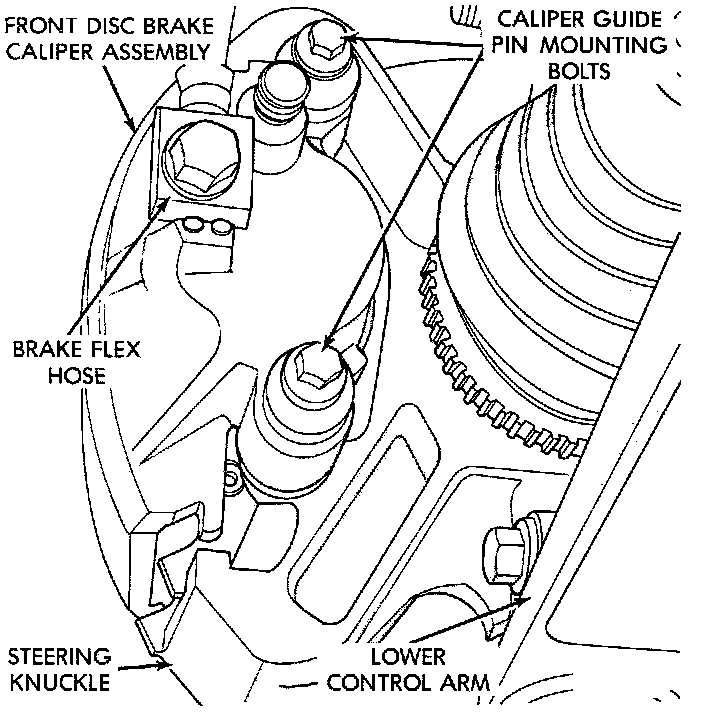 The double pin Kelsey-Hayes Calipers are mounted directly to the steering knuckles and use no adapter. The caliper is mounted to the steering knuckle using bushings, sleeves and 2 guide pin bolts which thread directly into bosses on the steering knuckle. Two machined abutments on the steering knuckle position the caliper. The guide pin bolts, sleeves and bushings control the side to side movement of the caliper. The piston seal is designed to pull the piston back into the bore of the caliper when the brake pedal is released. This maintains the proper brake shoe to rotor clearance.All the front brake forces generated during braking of the vehicle is taken up directly by the steering knuckles of the vehicle.