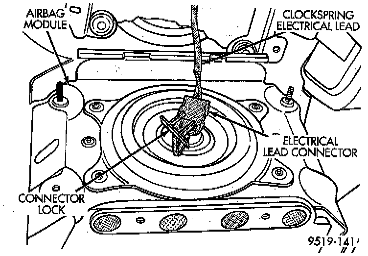 17. Install air bag electrical lead from clock spring, into connector on back of air bag module. Insert locking tab into back of air bag connector. Be sure electrical connector from clock spring is securely latched into air bag module connector.