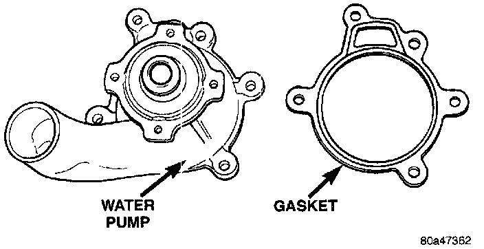 NOTE: Water pump is removed between the front upper crossmember and power steering gear.