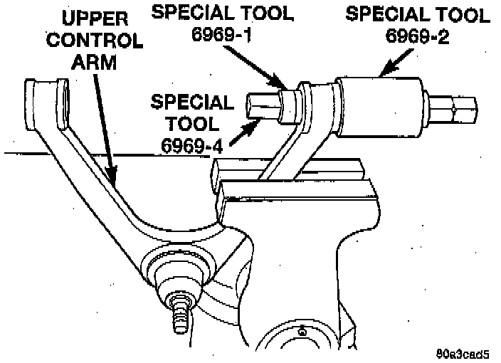 6. Transfer Remover, Special Tool 6969-2, Remover, Special Tool 6969-1 and Nut, Special Tool 6969-4, or equivalents to the remaining isolator bushing in the upper control arm.
