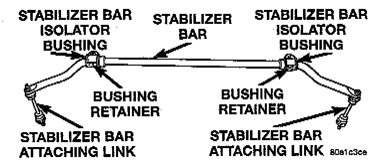 Attachment of the stabilizer bar to the frame of the vehicle is through 2 rubber-isolator bushings and bushing retainers. The stabilizer bar to lower control arm attachment is done utilizing a ball joint type, stabilizer bar attaching link. All parts of the stabilizer bar are replaceable as individual components, and the stabilizer bar isolator bushings are split for easy removal and installation.