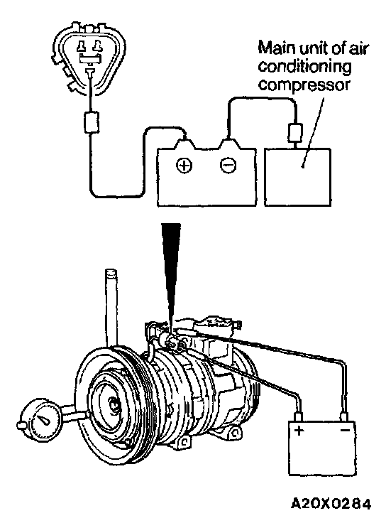Apply battery voltage to the magnetic clutch and check that the air gap is within the standard value. If the air gap is outside the standard value, adjust with a shim.