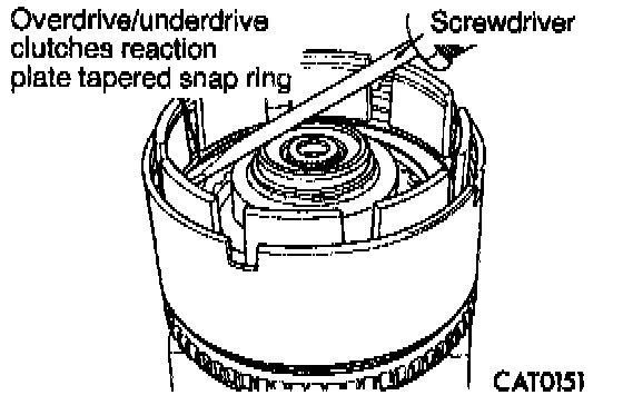 14. Remove overdrive/underdrive clutches reaction plate tapered snap ring. Do not scratch reaction plate.