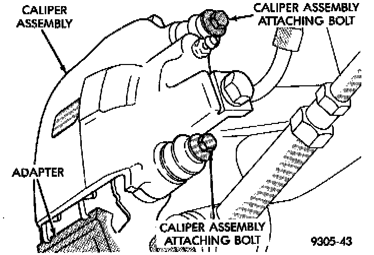 4. Remove caliper from adapter using the following procedure. First rotate top of caliper away from adapter. Then lift caliper assembly off bottom abutment of adapter to remove it from the vehicle.