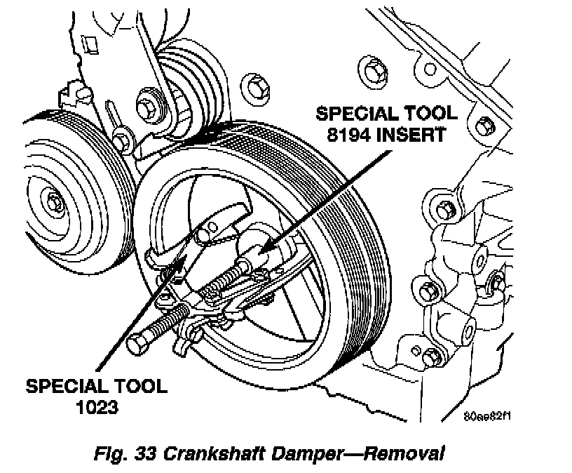 4. Remove damper by using Special Tools 8194 Insert and 1023 Three Jaw Puller (Fig. 33).
