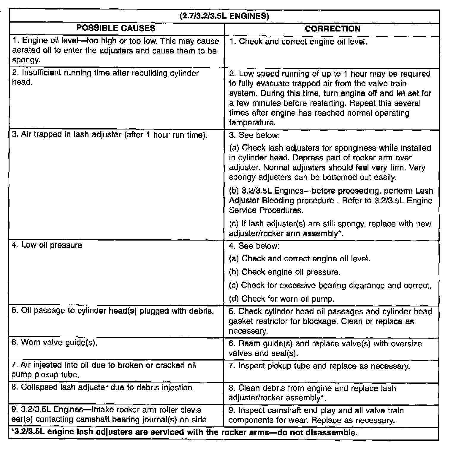 Refer to Lash Adjuster (Tappet) Noise Chart for Possible Causes and Correction of a lash adjuster (tappet) type noise.