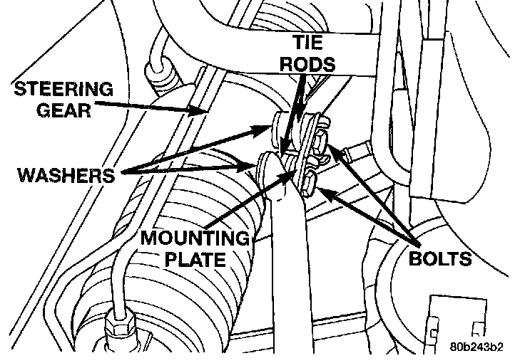11. Bend back the retaining tabs on the mounting plate for the tie rod to steering gear mounting bolts.