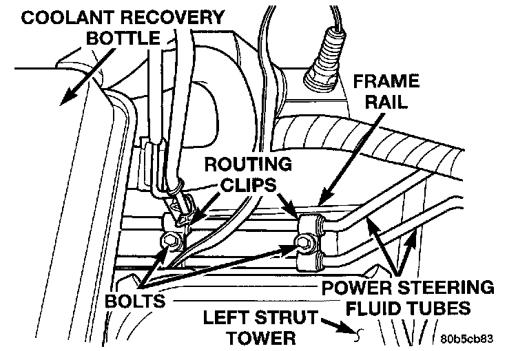 21. Remove the bolts mounting the power steering hoses to the left frame rail.