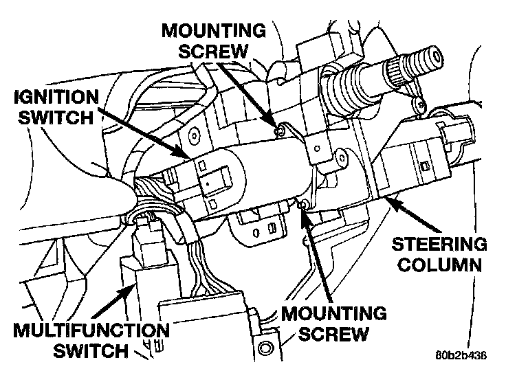 25. Remove the 2 screws mounting the ignition switch to the steering column. Remove the ignition switch, with the wiring harness attached, from the steering column.