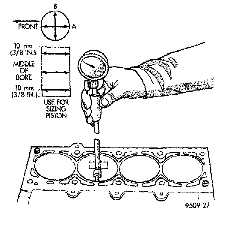 Measure the cylinder bore at three levels in directions A and B. Top measurement should be 10 mm (3/8 inch) down and bottom measurement should be 10 mm (3/8 inch) up from bottom of bore.