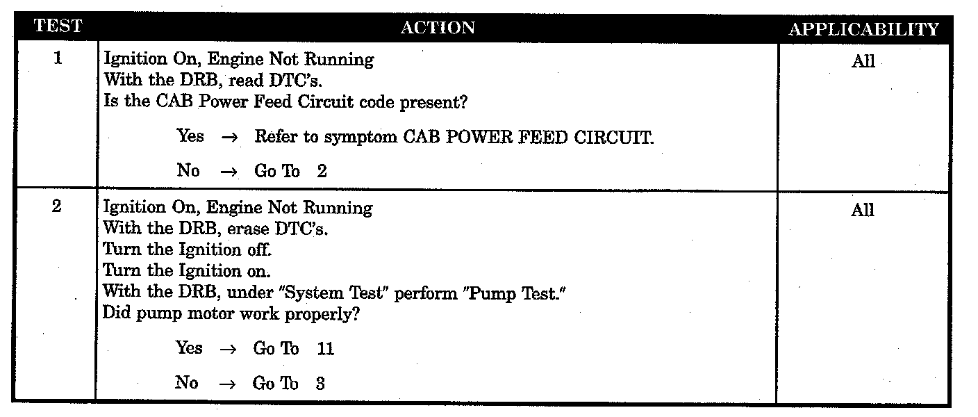 When Monitored: Ignition on. The CAB monitors the pump at all times. The CAB commands the pump on at 19 km/h (12 mph) to check its operation, provided the brake is not applied. If the driver has their foot on the brake, the test will run at 39 km/h (24 mph).