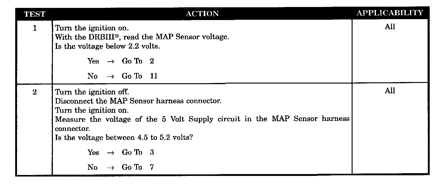 The PCM senses the voltage from the MAP sensor to be less than 2.196 volts but above 0.0392 volts for 300 milliseconds.