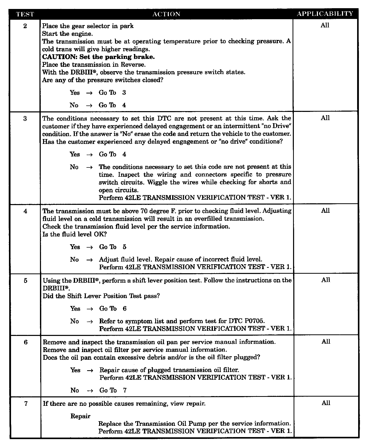 Set Condition: If the Transmission begins to slip in a forward gear and the pressure switch(s) that should be closed are open a loss of prime test begins. Available elements are turned on by the TCM to see if pump prime exists. The code sets if no pressure switches respond.
