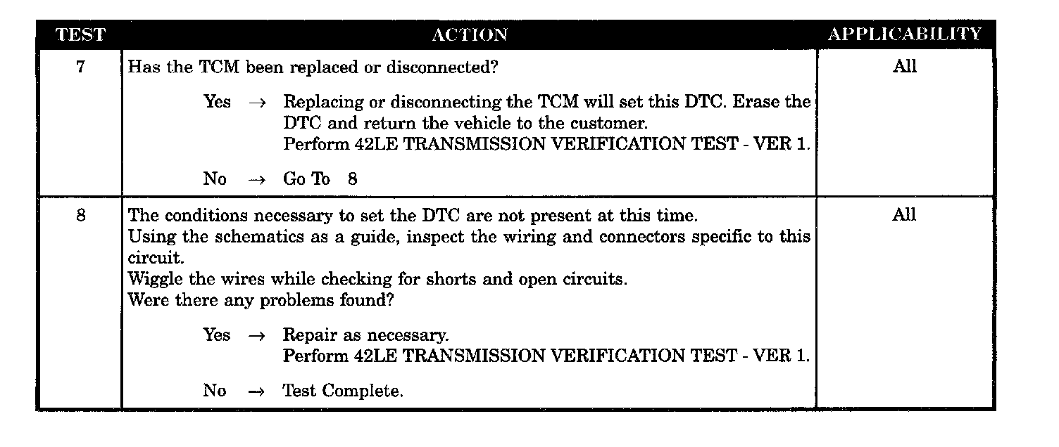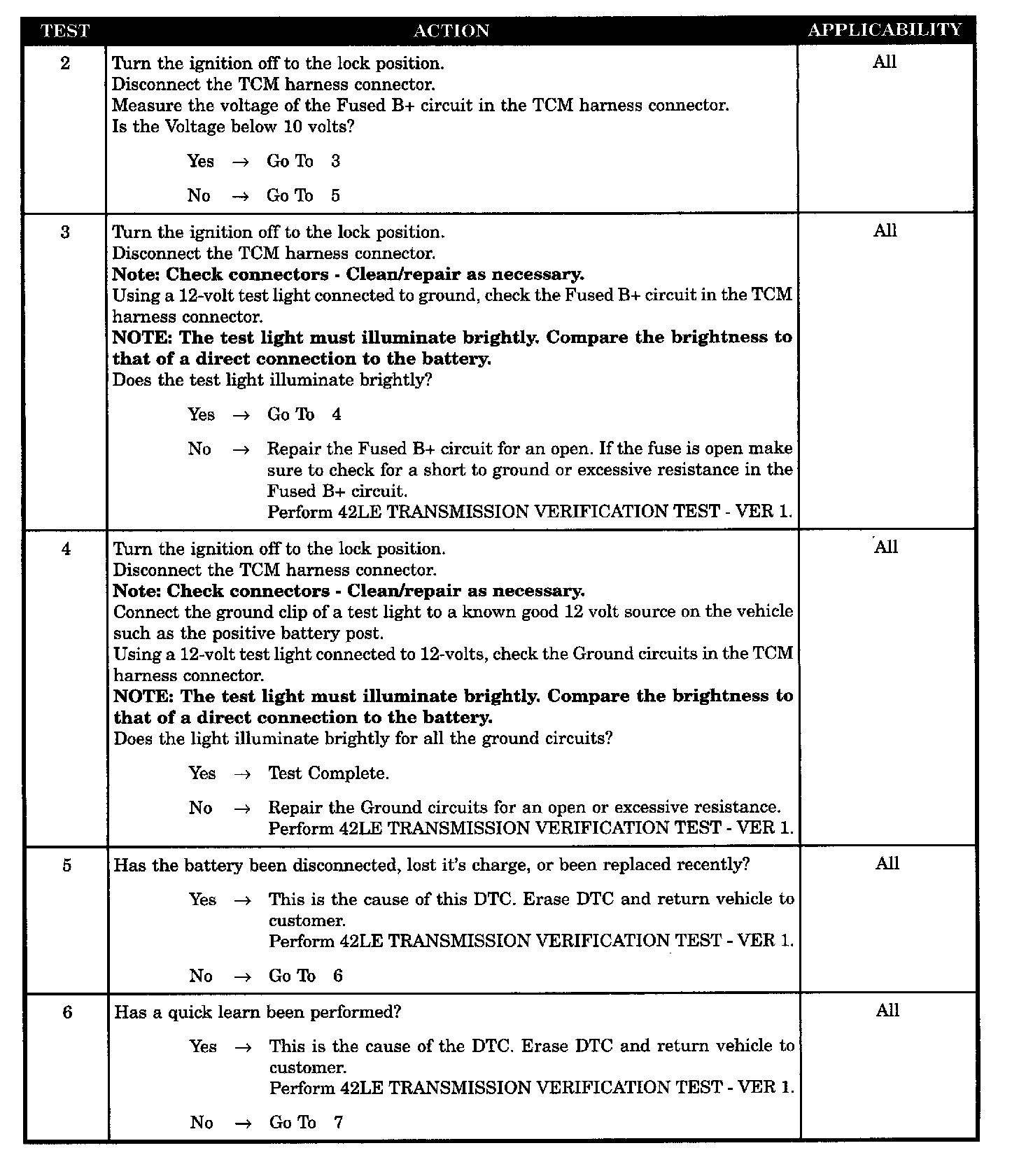 Set Condition: This code is set whenever Transmission Control Module (TCM) is disconnected from battery power (B+) or ground. It will also be set during the DRBIII(R) Quick Battery Disconnect procedure.