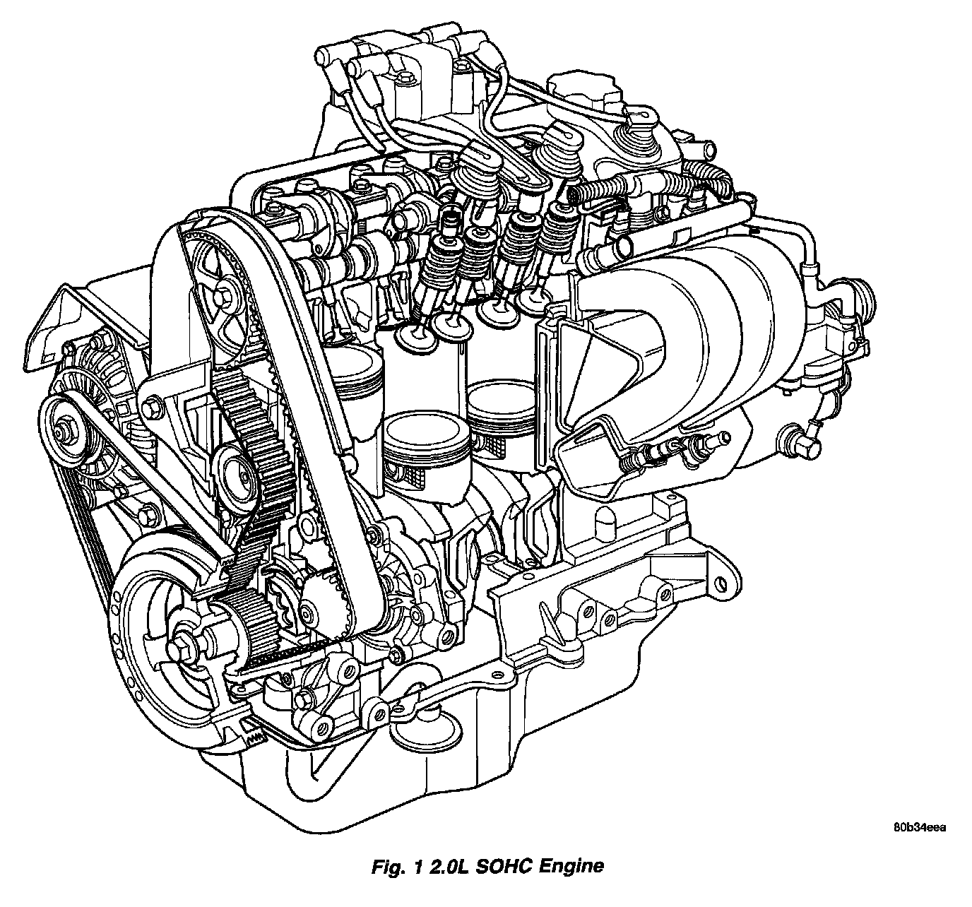 DESCRIPTIONThe 2.0 Liter (122 cu. inch) in-line four cylinder engine is a single over head camshaft with hydraulic lifters and four valves per cylinder design (Fig. 1). The engine does not have provisions for a free wheeling valve train.