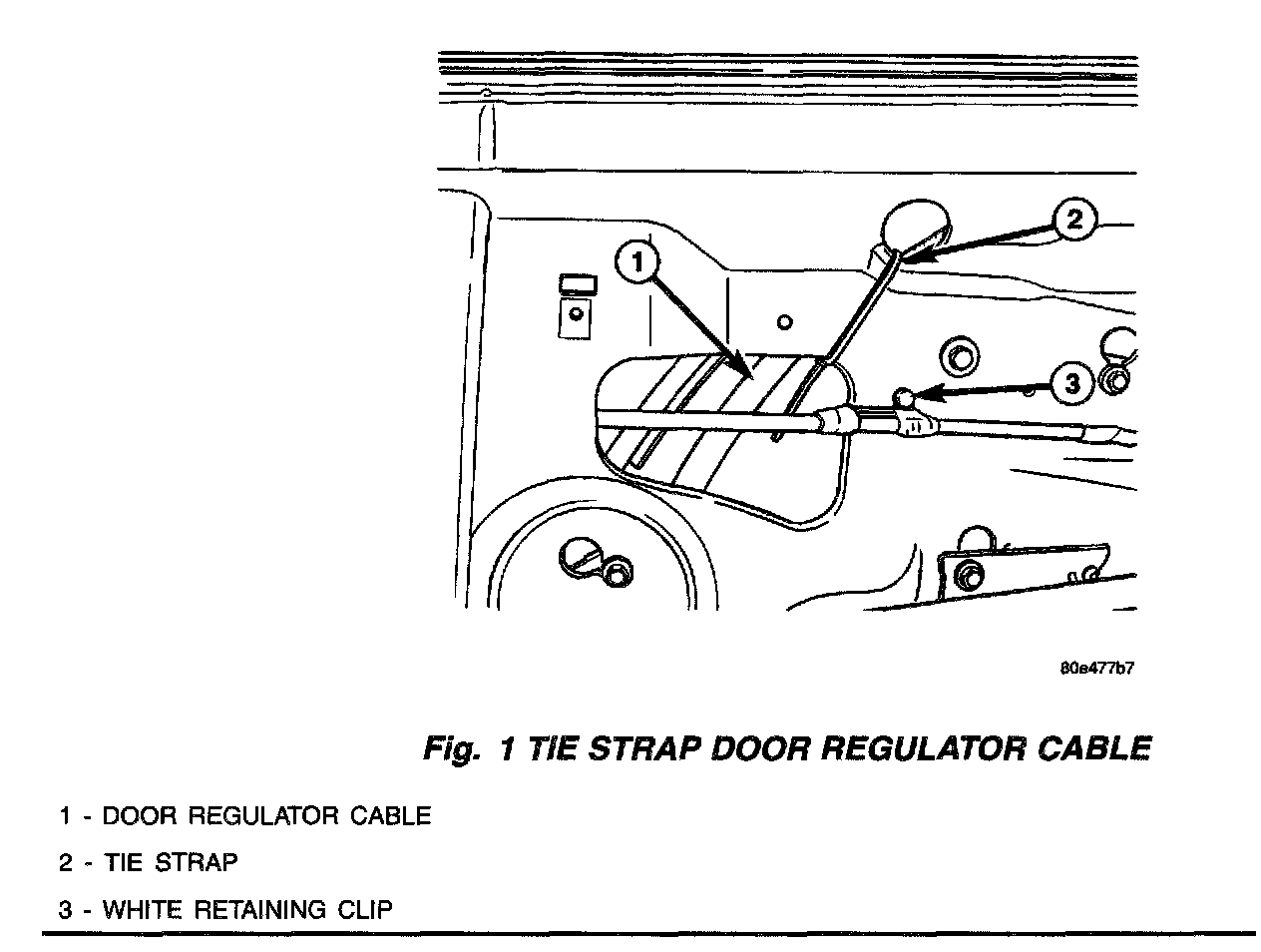 3. Install the tie strap around the outboard regulator cable and door inner sheet metal as shown (Fig. 1). Cut off the excess tie strap material.