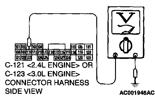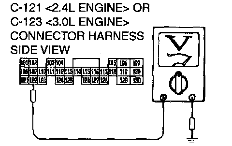 STEP 8. Check the switch output voltage at PCM connector C-121 <2.4L Engine> or C-123 <3.0L Engine> by backprobing.