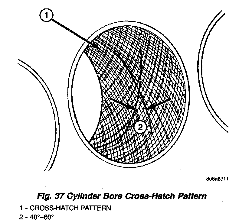3. Honing should be done by moving the hone up and down fast enough to get a cross-hatch pattern. When hone marks intersect at 40-60 degrees, the cross hatch angle is most satisfactory for proper seating of rings (Fig. 37).