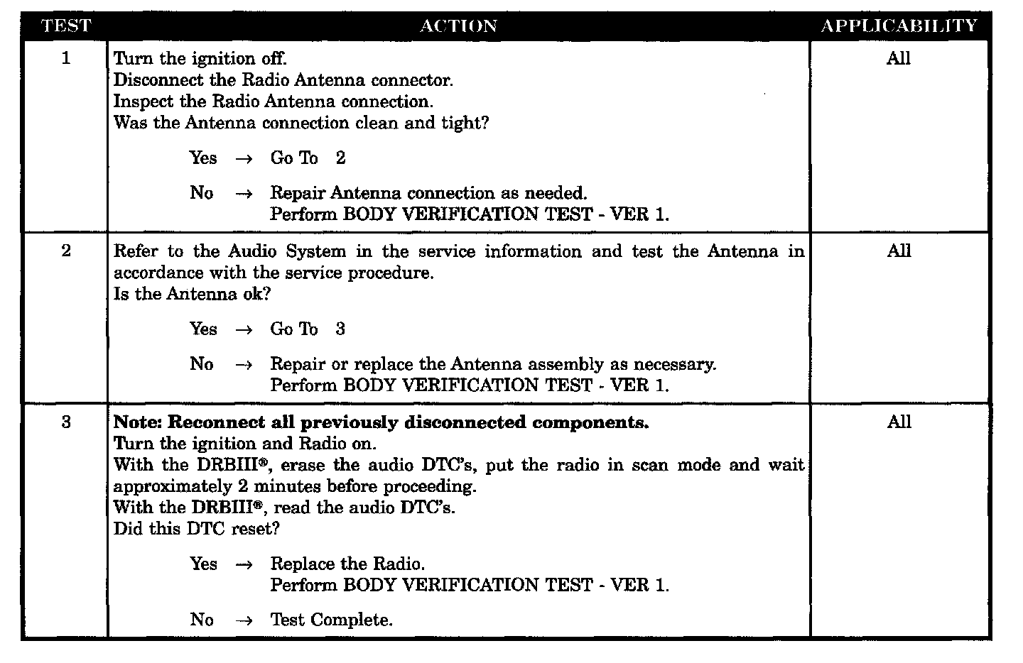 With the radio in seek or scan mode for two minutes and the radio does not detect an antenna connection or does not receive a radio station signal.