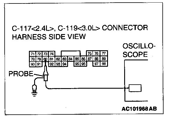2. Connect an oscilloscope probe to PCM connector C-117 <2.4L> or C-119 <3.0L> terminal 80 by backprobing.