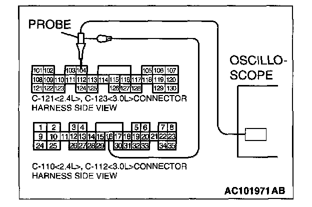 2. Connect an oscilloscope probe to PCM connector C-110 <2.4L> or C-112 <3.0L> terminal 16 and to PCM connector C-121 <2.4L> or C-123 <3.0L> terminal 104 by backprobing.