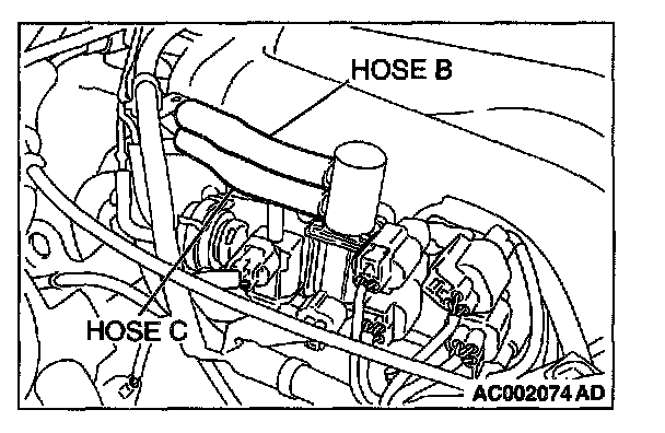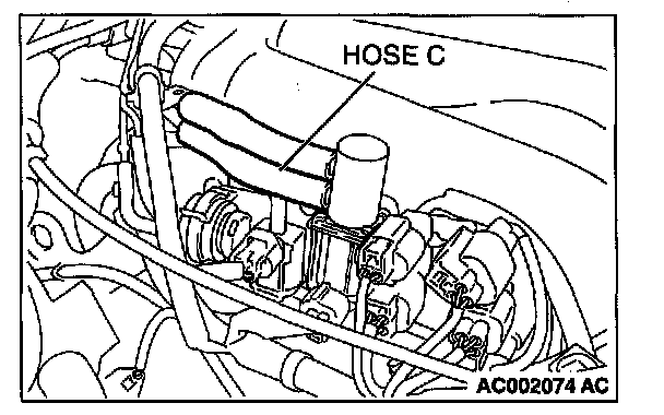 3. Disconnect hose C from the evaporative emission purge solenoid side, and connect a hand vacuum pump to the nipple of the evaporative emission purge solenoid.