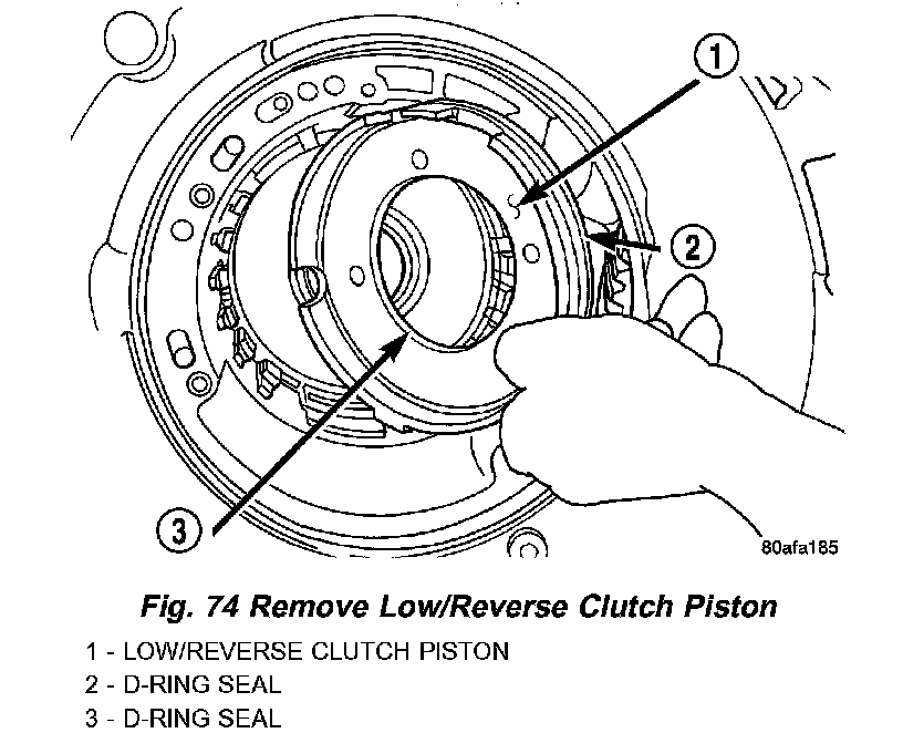 59. Remove low/reverse spring compressor tool and low reverse piston return spring (Fig. 70).