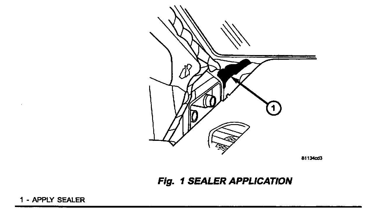 3. Apply a thumb grade sealer, Mopar Butyl Tape, p/n 04076274, or equivalent to completely close the hole at the base of the A-pillar (Fig. 1).