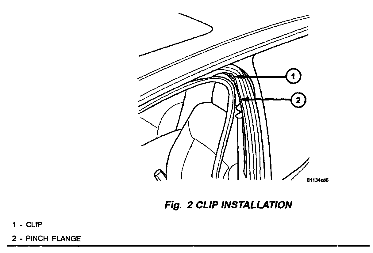2. For vehicles built on or before May 15, 2001, install clip, 05019585M, on the pinch flange in area where weatherstrip is loose. One lip in the center of the pulled away area should be enough (Fig. 2).