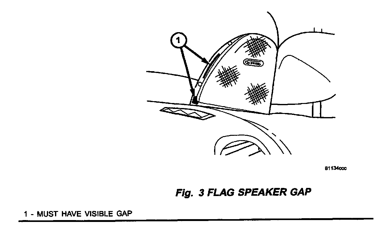 1. There should be a visible gap (not touching) between the front edge of the front window flag speakers and the front door body mounted weatherstrips (Fig. 3). If a gap exists proceed to Procedure D. If no gap exists proceed to step 2.