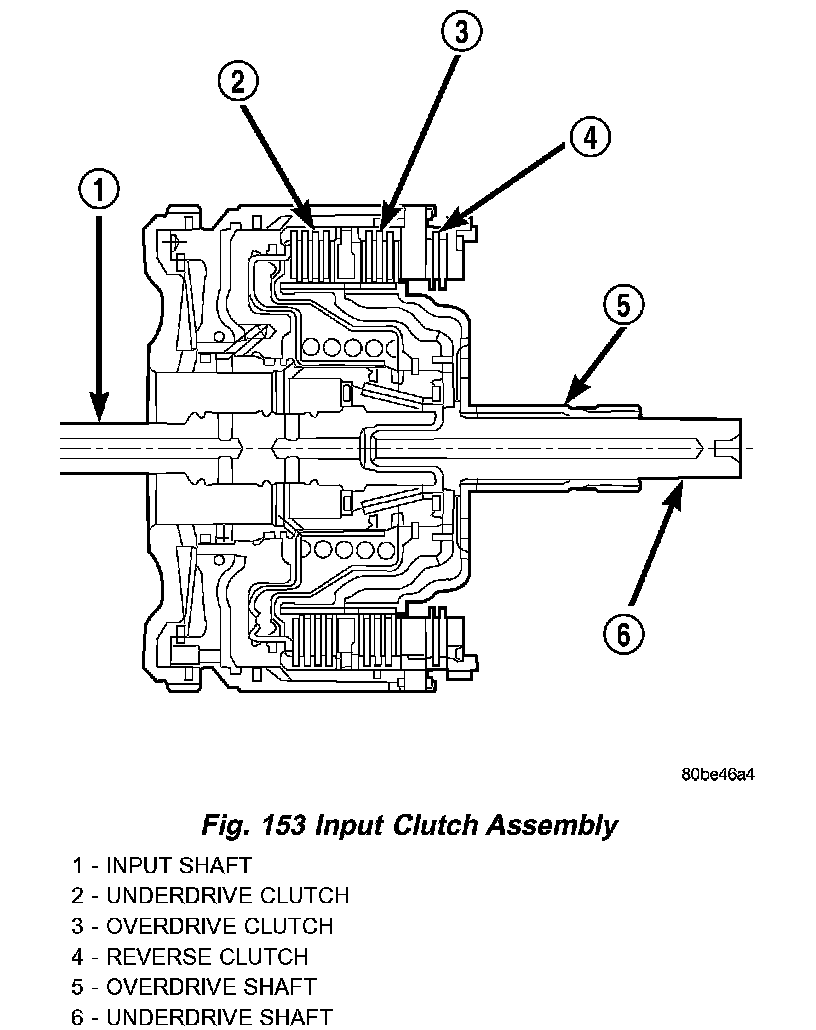 Three hydraulically applied input clutches are used to drive planetary components. The underdrive, overdrive, and reverse clutches are considered input clutches and are contained within the input clutch assembly (Fig. 153). The input clutch assembly also contains: