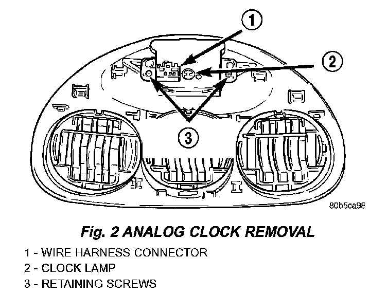 6. On the bench, remove two retaining screws to analog clock and remove from bezel (Fig. 2).