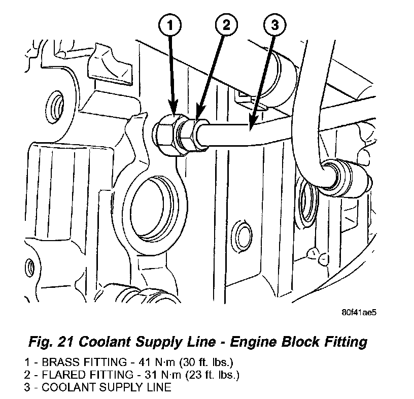 4. Disconnect coolant supply line flared fitting from brass fitting at engine block (Fig. 21).