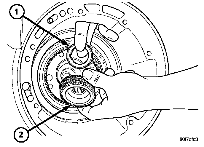 42. Remove the rear sun gear (2) and #7 needle bearing (1).
