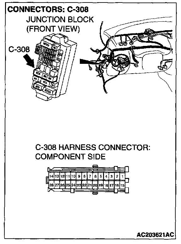 STEP 3. Check auto-cruise control-ECU connector C-21, combination meter connector C-101 and junction block connector C-308 for loose, corroded or damaged terminals, or terminals pushed back in the connector.