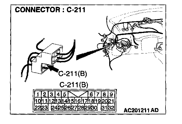 NOTE: Also check intermediate connector C-211. If intermediate connector C-211 is damaged, repair or replace the connector as described in Harness Connector Inspection.