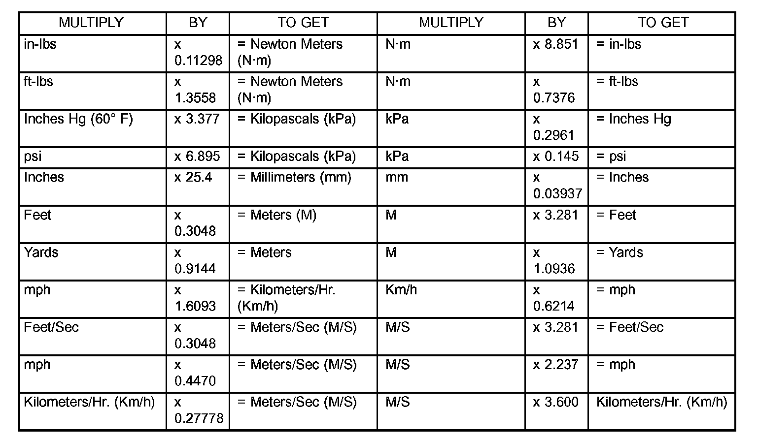 Refer to the Metric Conversion Chart to convert torque values listed in metric Newton- meters (N.m). Also, use the chart to convert between millimeters (mm) and inches (in.).
