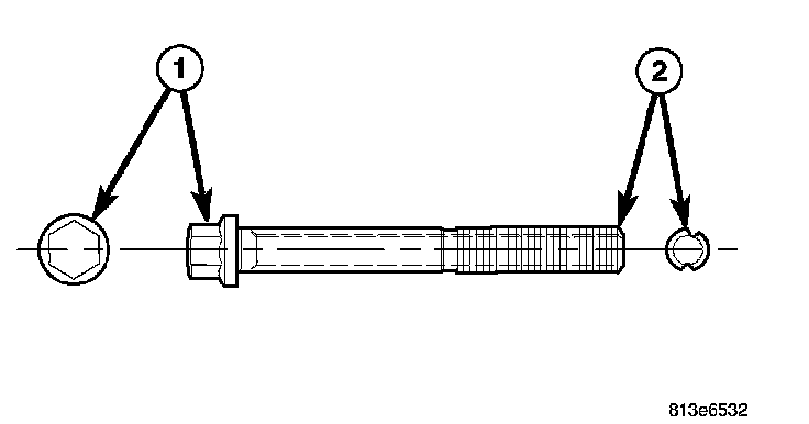 CAUTION: If the lower control arm bolt at the engine cradle has a lengthwise grooved shaft (2), it is a special wheel alignment adjustment bolt and the bolt head (1) must not be rotated in the vehicle or damage to the bolt and engine cradle will result. While holding the bolt in place with a wrench, remove the nut, then slide the bolt out of the bushing and cradle taking note of bolt positioning in engine cradle for reassembly purposes. The bolt needs to be installed in the same position as removed to make sure wheel camber and caster return to adjusted position.