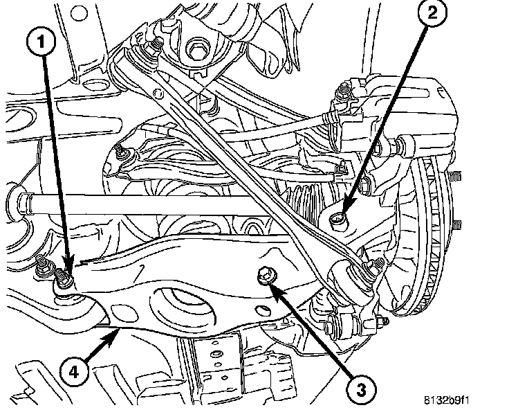 9. Remove bolt and nut (1) fastening spring link (4) to crossmember.