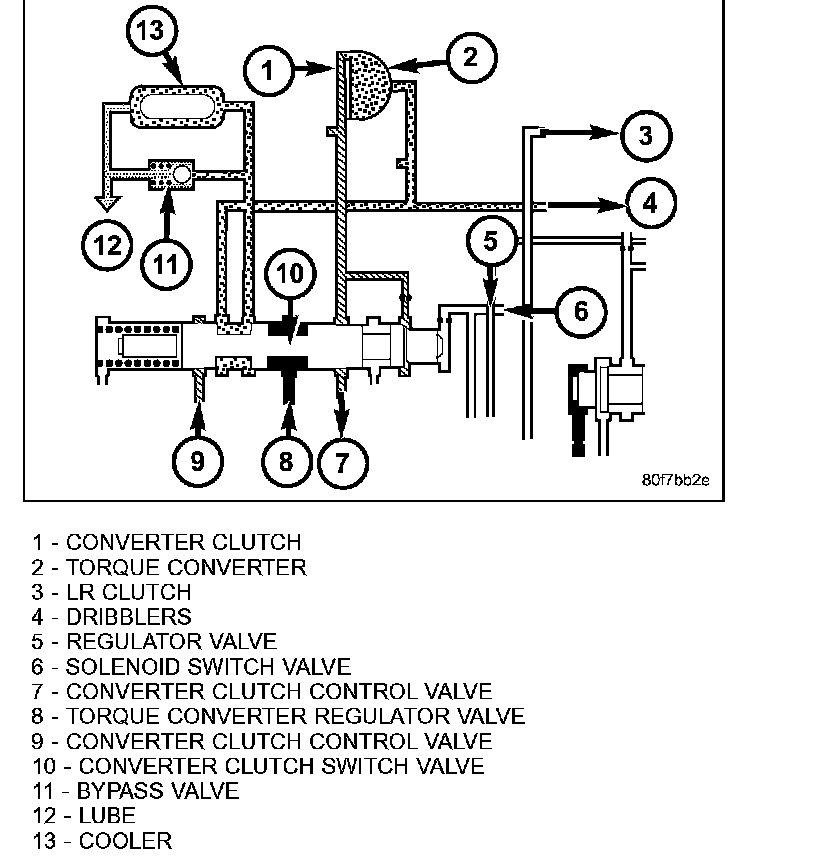 The converter clutch control valve (5) controls the back (on) side of the torque converter clutch (1). When the controller energizes or modulates the LR/CC solenoid to apply the converter clutch piston, both the converter clutch control valve (5) and the converter control valve move, allowing pressure to be applied to the back side of the clutch.