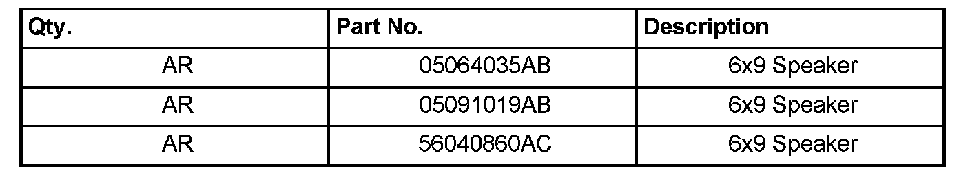 1. Replace all the 6x9 speakers in the vehicle following the procedures available in DealerCONNECT > TechCONNECT > 8 - Electrical > Radio > Speaker > Removal and Installation. Refer to table below for 6x9 speaker quantities and location details.