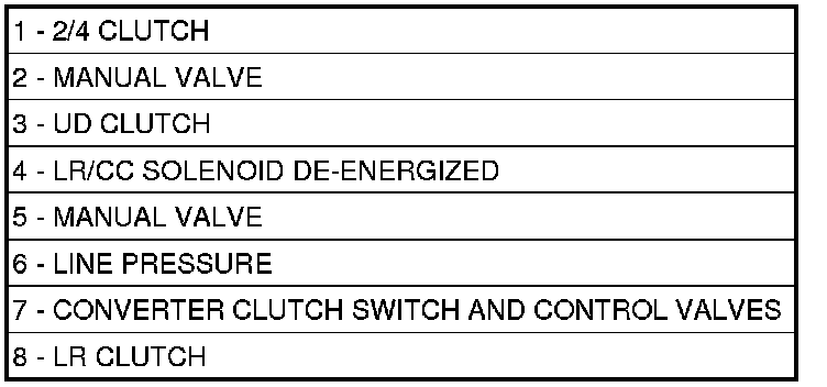 The main responsibility of the converter clutch switch valve (10) is to control hydraulic pressure applied to the front (off) side of the converter clutch piston. Line pressure from the regulator valve (5) is fed to the torque converter regulator valve (8). The pressure is then directed to the converter clutch switch valve (10) and to the front side of the converter clutch piston. This pressure pushes the piston back and disengages the converter clutch.